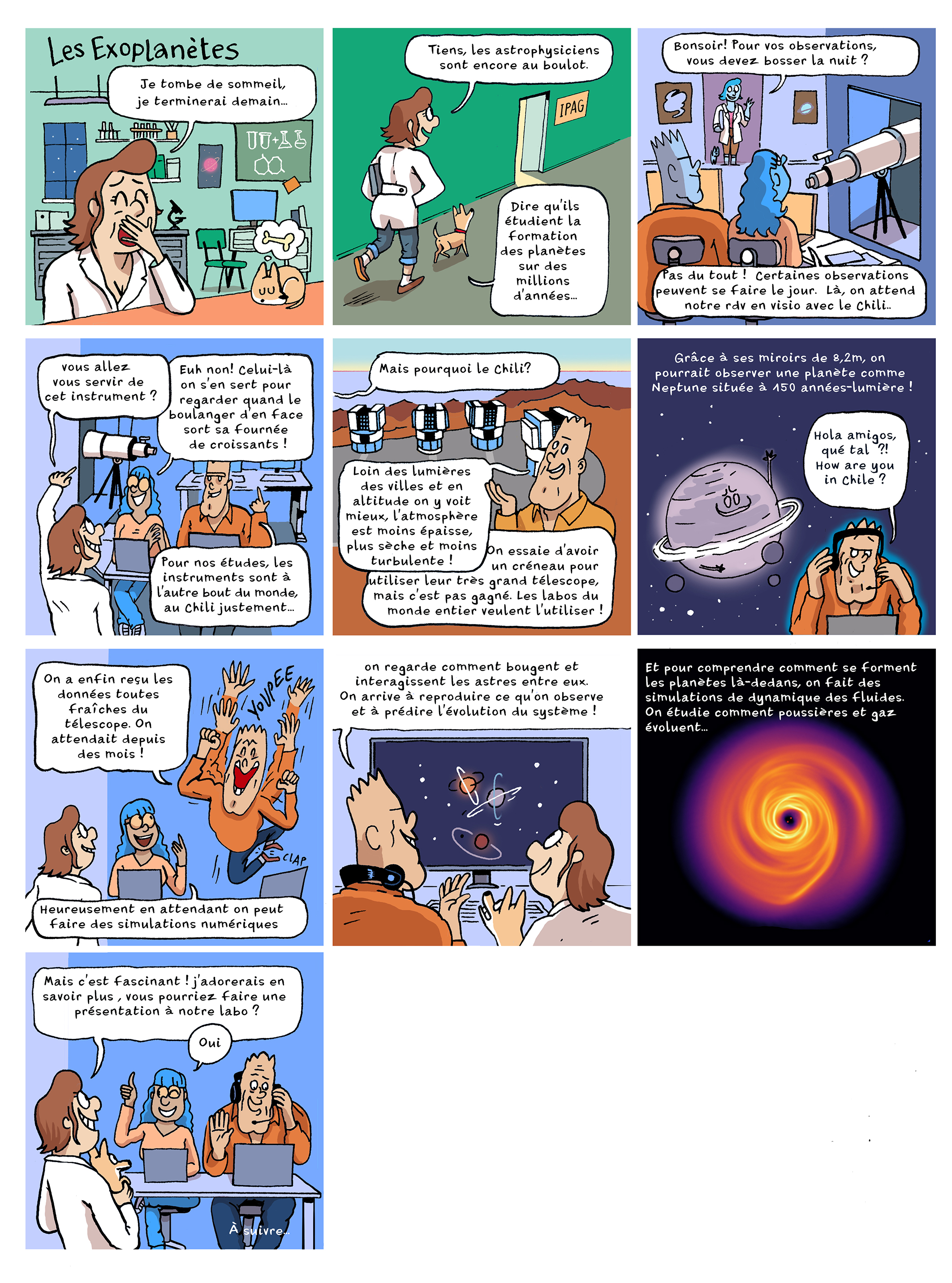 Pour répondre à ces questions et illustrer le travail de recherche mené à l’Institut de Planétologie et d’Astrophysique de Grenoble (IPAG-OSUG), les scientifiques de l’équipe du projet européen Stellar-MADE dirigée par Nicolás Cuello, enseignant-chercheur UGA à l’IPAG, ont collaboré en partenariat avec Ink Link et Séverine Alvain, Chargée de médiation scientifique au CNRS à la réalisation de 4 planches de BD.